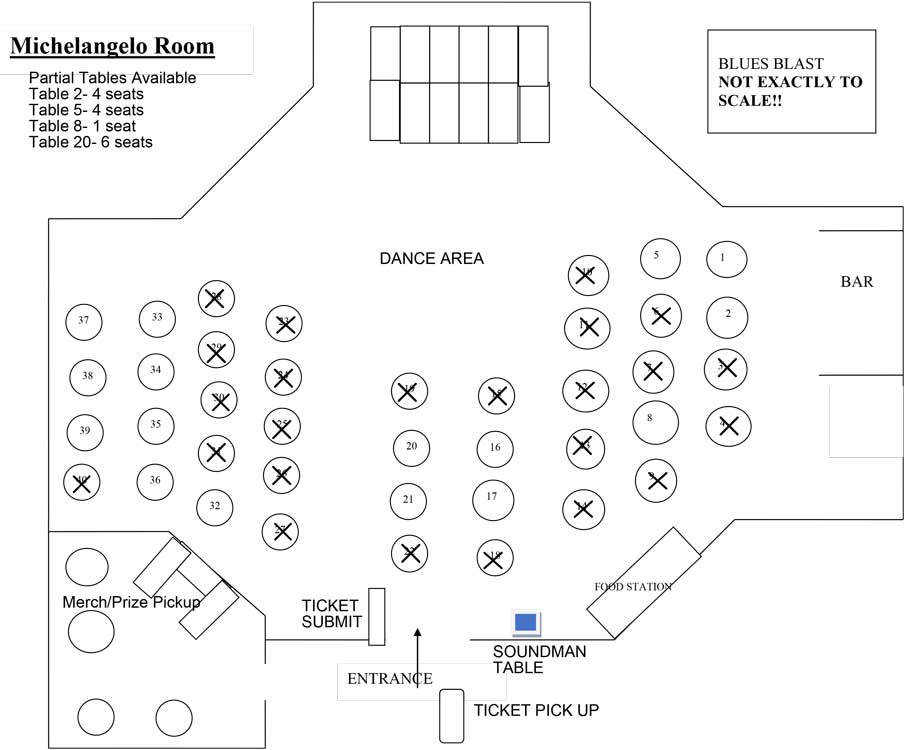 See the floor map below with table numbers. Tables marked with ”X” are reserved for bands and sponsors and are unavailable. There are eight seats at each table.